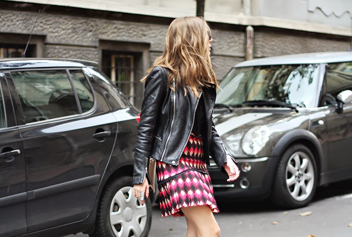 I picked the gorgeous dress from INES atelier ( already wore it Here) and paired it with leather jacket, classic black shoes and cross body bag. Earrings came as a cherry on top.